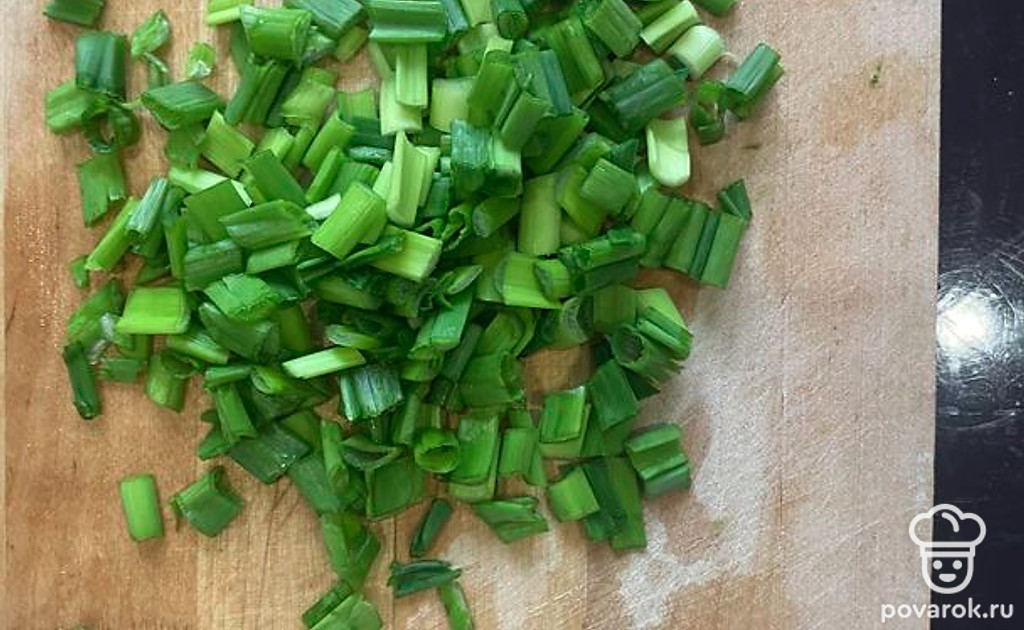 Нарезать зелёный лук.
