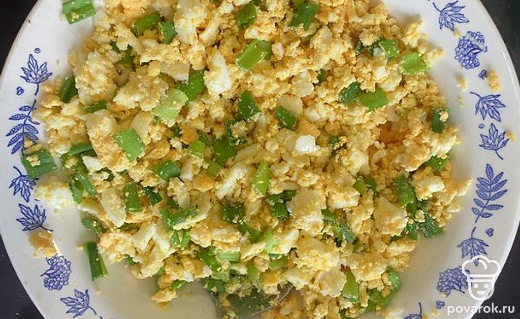 Порезать яйца и смешать с луком, добавить шепотку соли.