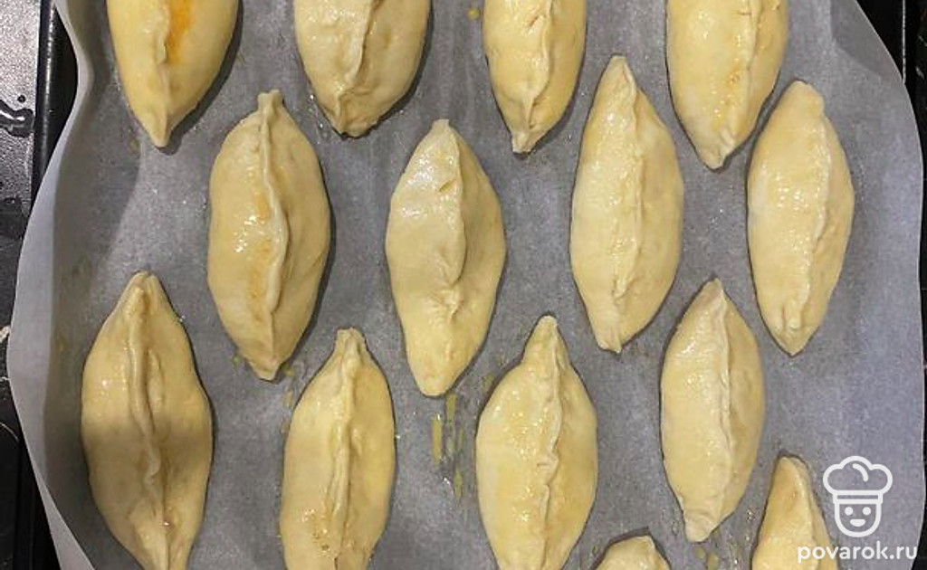 Сделать так все пирожки. Переложить на противень и смазать сбитым яйцом. Затем поставить в духовку на 20 минут при 180 градусах.