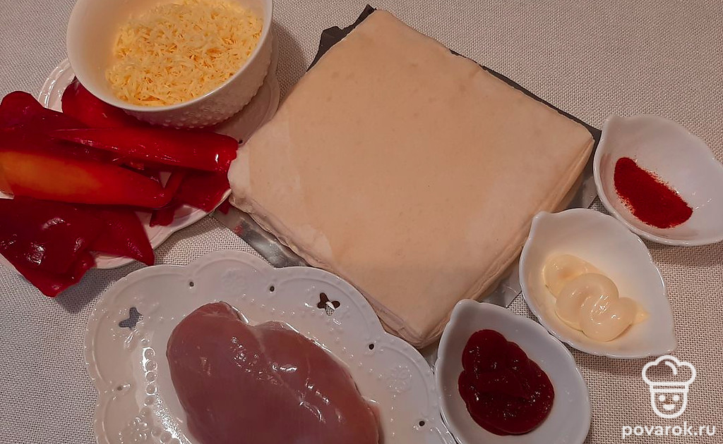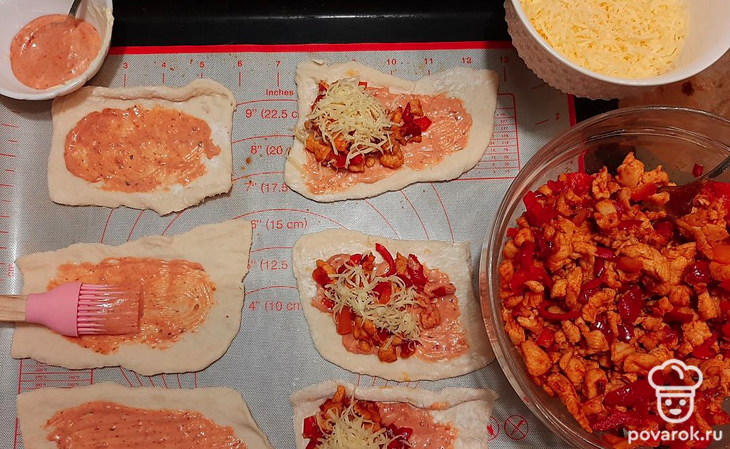 Раскатываем тесто и режем на полоски нужного размера. Чем шире полоска, тем больше размером пирожок. Смешиваем кетчуп с майонезом и смазываем каждую полоску, выкладываем начинку из курицы и перца и посыпаем сверху натертым сыром.