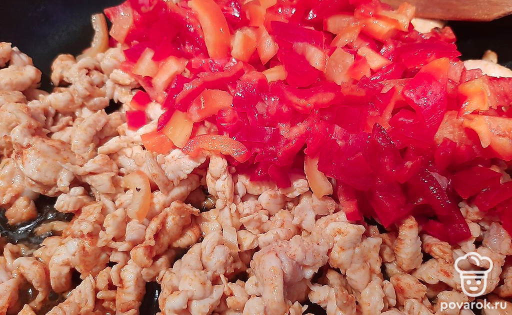 Разогреваем духовку, режем мелким кубиком куриную грудку и болгарский перец. Обжариваем на высокой температуре курицу 5 минут, добавляем к ней нарезанный перец и продолжаем жарить еще 5 минут, часто перемешивая. Выключаем плиту, добавляем молотую сладкую паприку, перемешиваем все ингредиенты и накрываем крышкой.