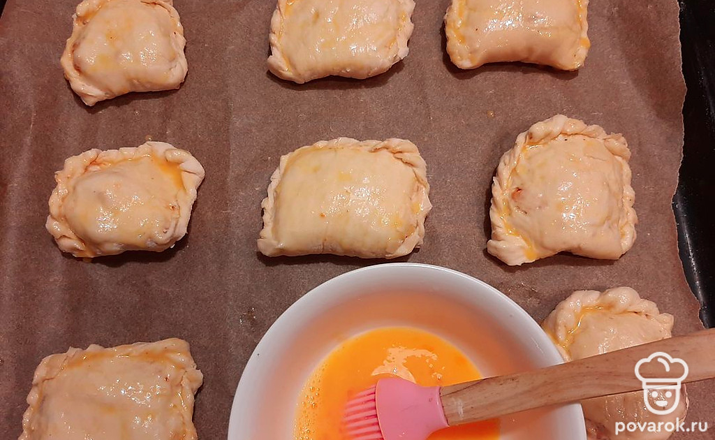 Залепляем пирожок удобным способом. Чтобы пирожок получился золотистого цвета, перед тем, как отправить его в духовку, нужно смазать поверхность сырым яйцом. Отправляем в духовку на 15 минут при 180 градусах. Пирожки получаются очень вкусные и необычные, с пикантной начинкой и тянущимся сыром.