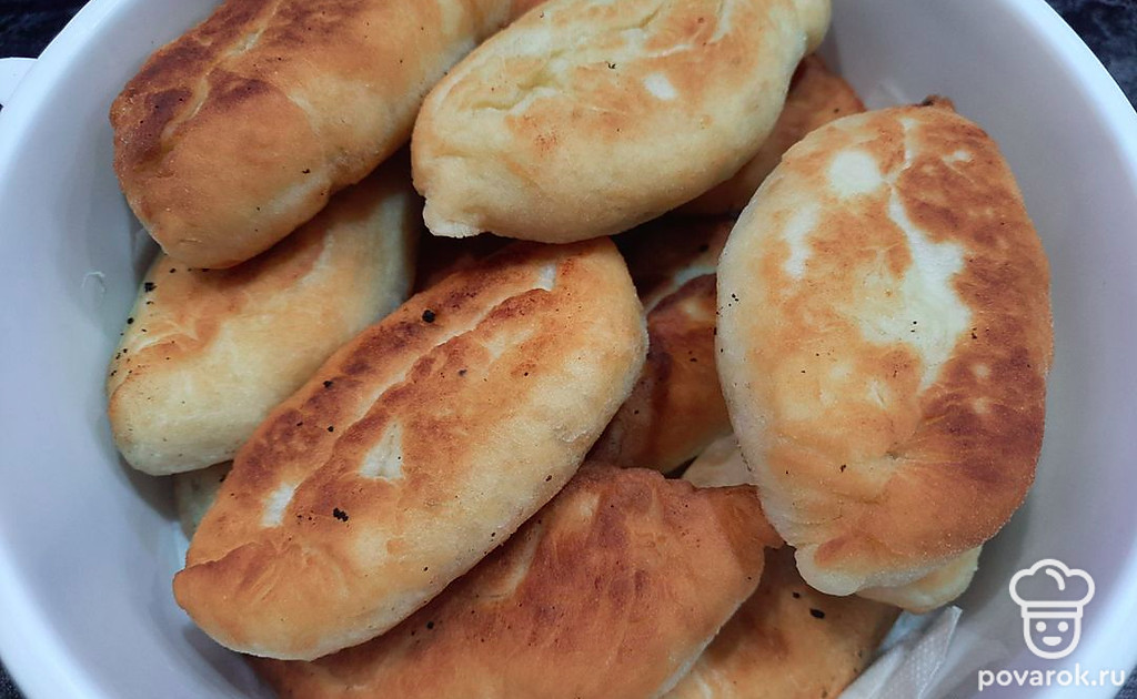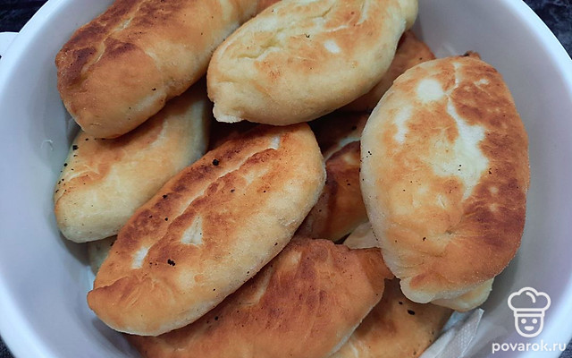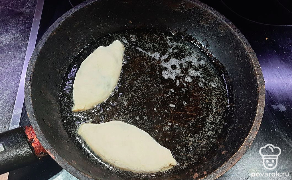 Разогреваем растительное масло на сковороде. Кладем пирожки в раскаленное масло, обжариваем с двух сторон до золотистой корочки.