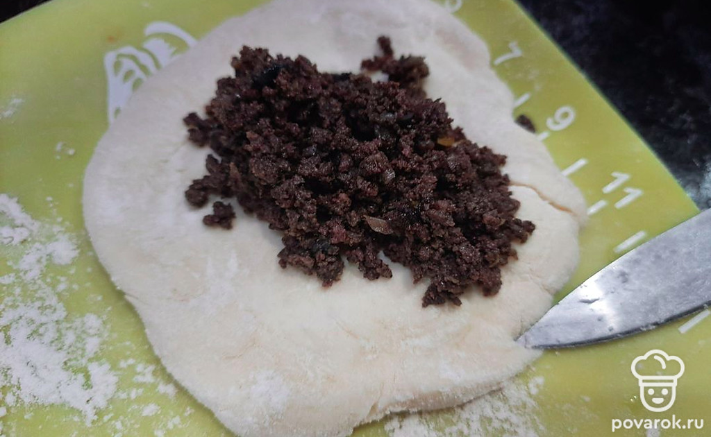 Разделяем тесто на кусочки размером с яйцо. Раскатываем кусочки на довольно тонкие сочни. Укладываем на каждый сочень начинку.