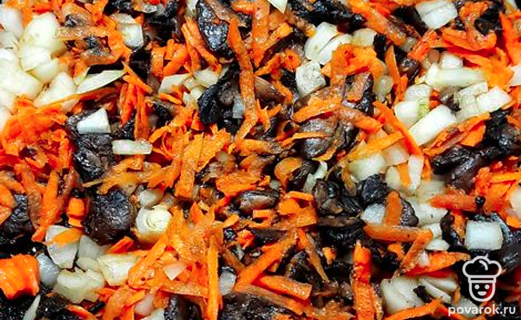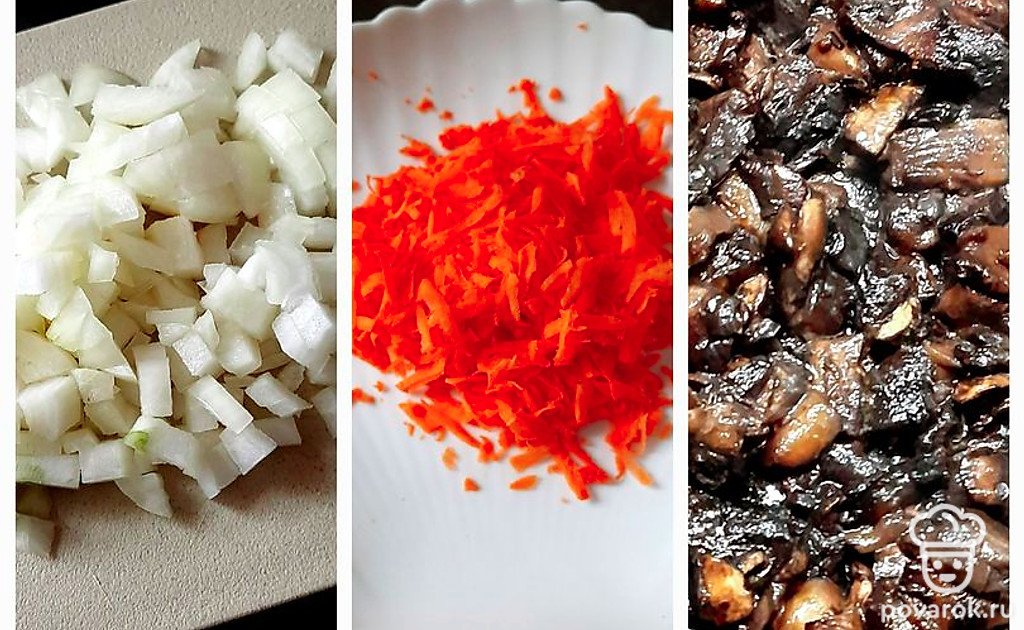 Порежьте мелко лук, грибы, натрите на терке морковь.