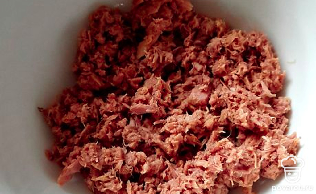 Разомните тунец вилкой и смешайте вместе с обжаркой.