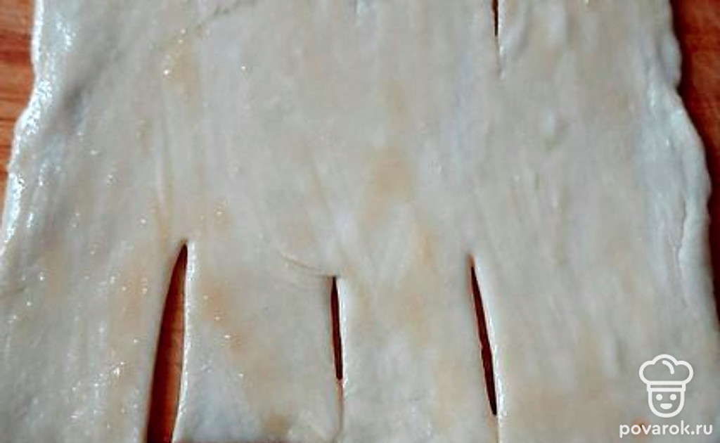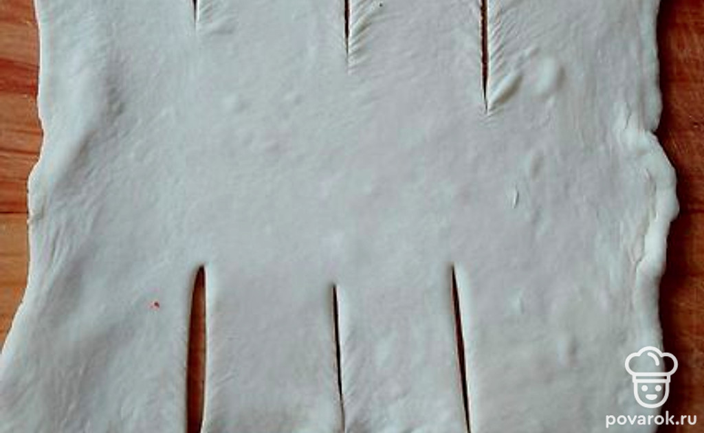 Подготовьте тесто, нарежьте его на квадраты и сделайте надрезы со всех сторон, как указано на фото.