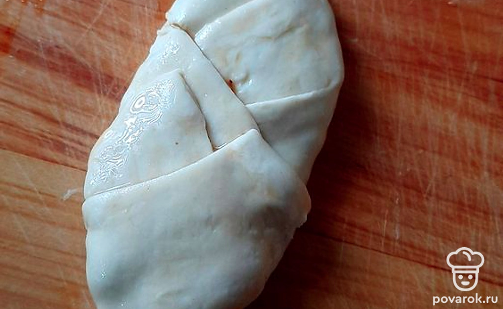 Выложите начинку и сформируйте пирожок, сложив тесто крест накрест. Сверху также обмажьте яйцом.