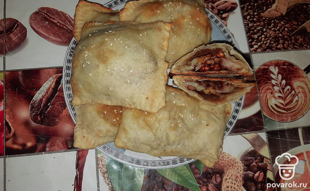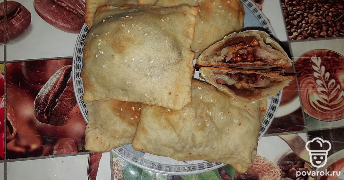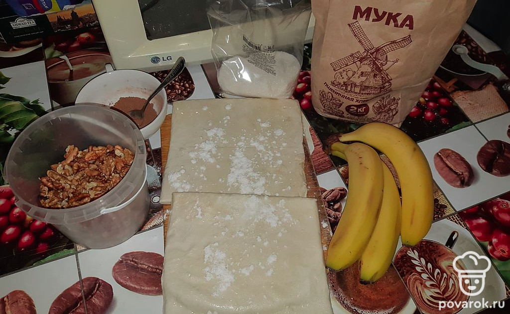 Положите на одну половину теста нарезанные бананы, сахар, корицу и дробленые орехи.