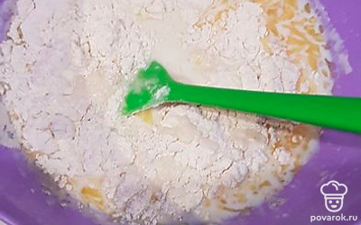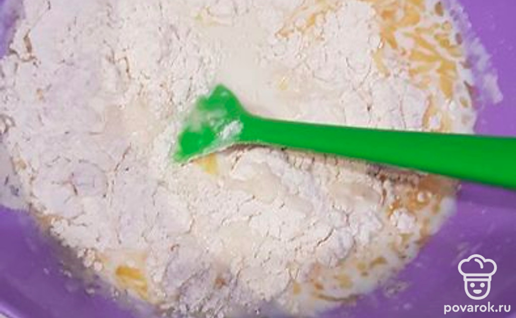 В теплый кефир добавляем сахар, соду, растительное масло 3 столовые ложки, яйцо, соль, муку, замешиваем тесто и оставляем.