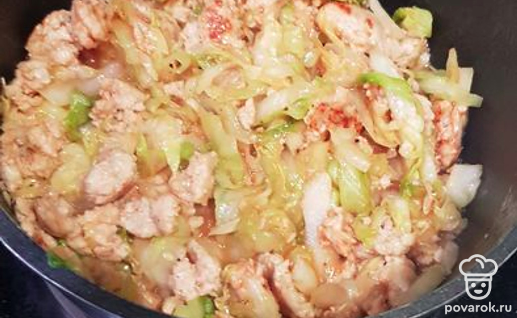 Делаем начинку обжариваем фарш, лук, шинкуем капусту и к начинке, соль и зелень. Тушим минут 20.
