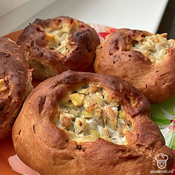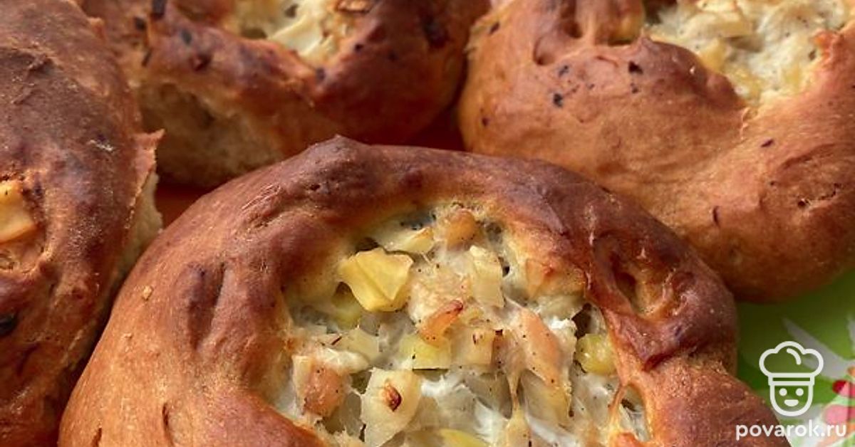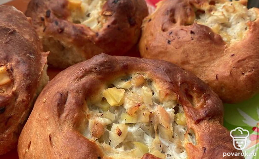 Разделить тесто на порционные кусочки, размять в блинчик, начинить и сформировать пирожок, но с небольшой дырочкой сверху. Оставить на противне на 30 минут для расстойки, при желании смазать яйцом. Выпекать в духовке при температуре 190 градусов до золотистого цвета.