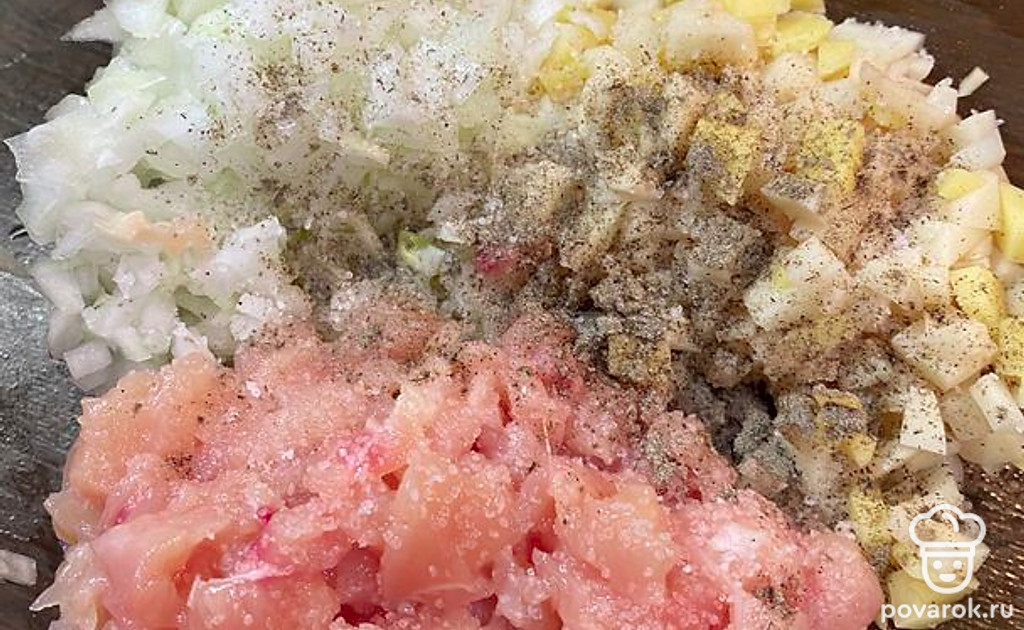 Соединить в миске с солью и чёрным молотым перцем и очень хорошо перемешать, чтобы лук выделил сок и пропитал им мясо и картофель.
