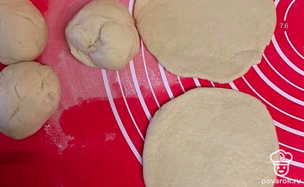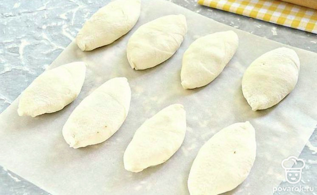 Подошедшее тесто обмять. Слепите пирожки и укладывайте их на противень на пергамент. Оставьте подойти еще минут на 10–15. Перед выпечкой пирожки можно смазать яйцом, взбитым с ложкой молока или сливок.