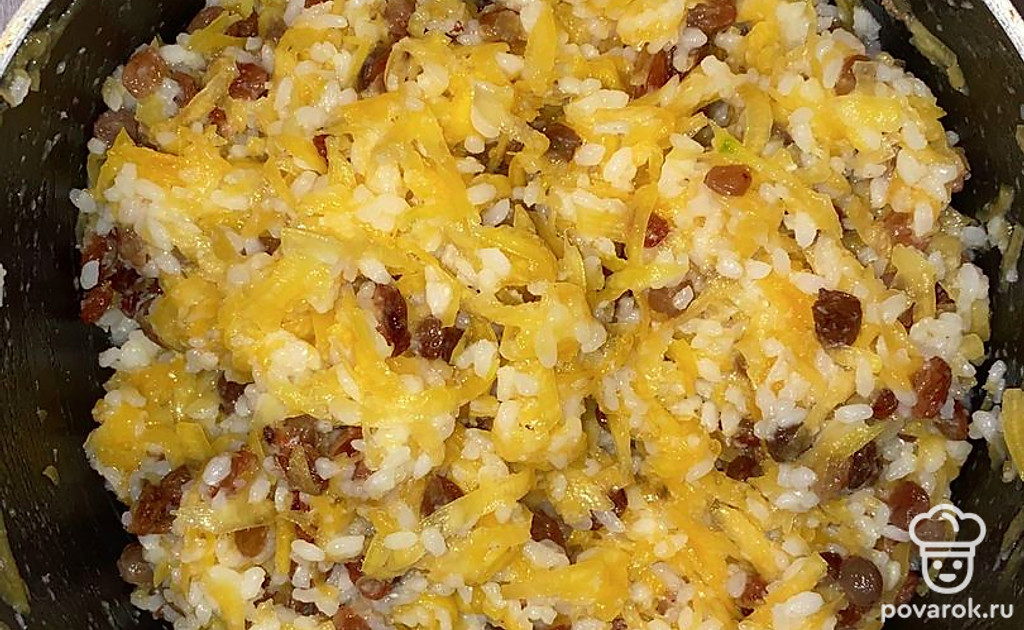 Слейте воду с изюма, переложите его в кастрюлю с рисом, туда же положите тыкву, всё хорошо перемешайте.