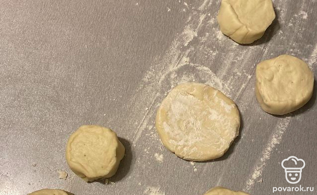Круги раскатайте в тонкие пласты толщиной 3 мм, выложите в середину начинку.