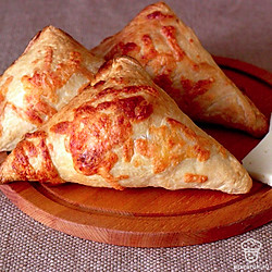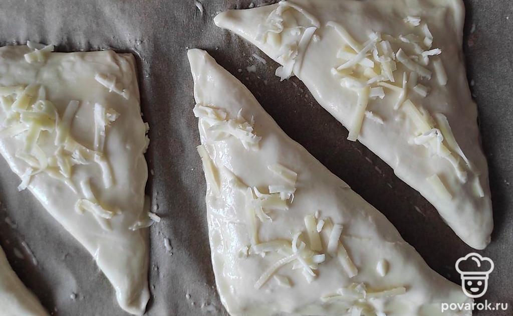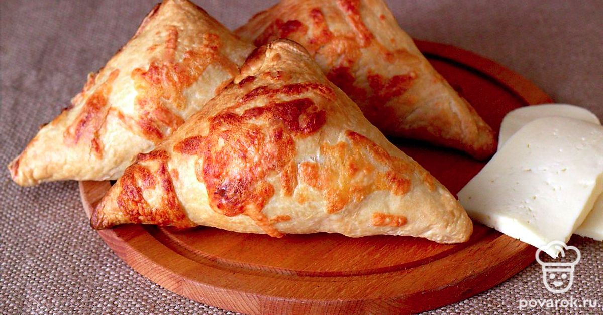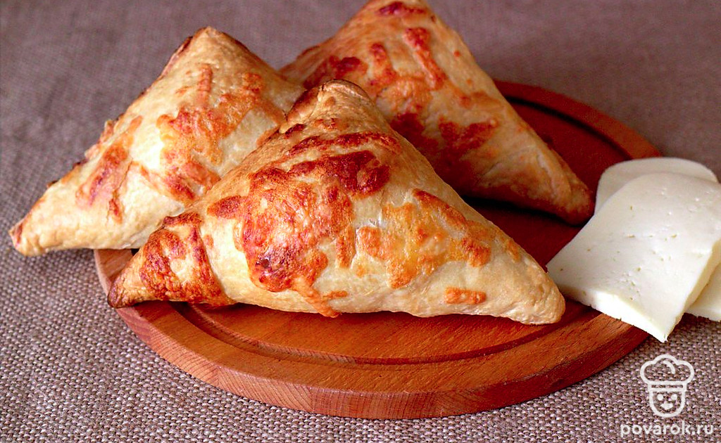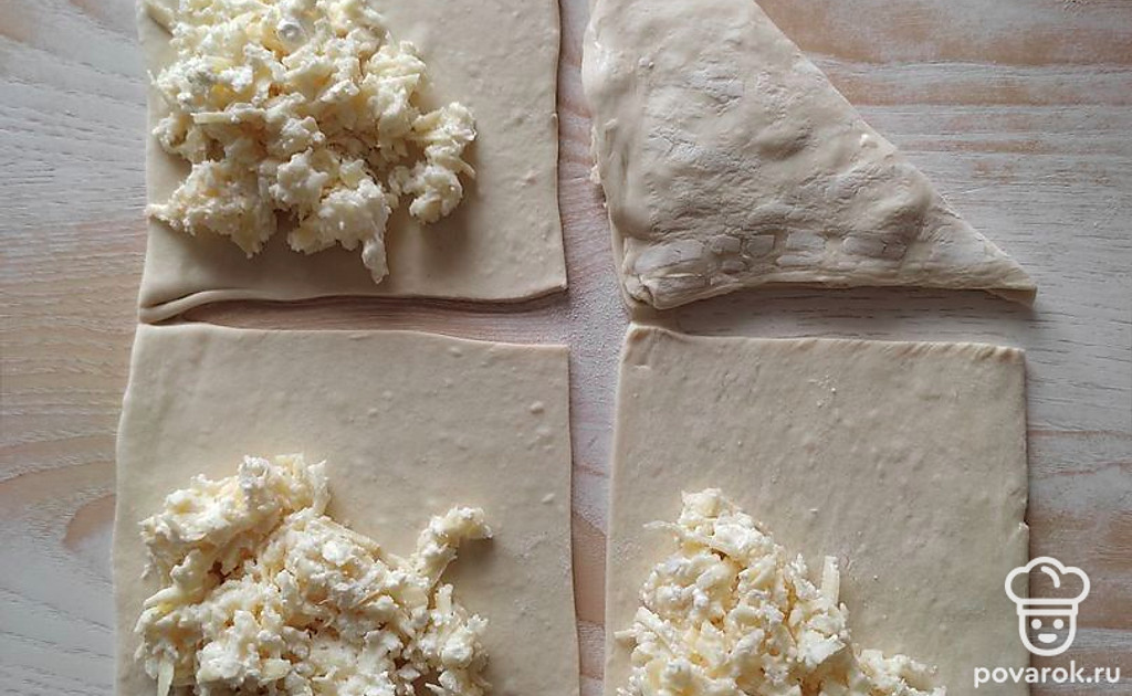 Выложите 1-2 ложки сырной начинки на половинку квадрата теста, сверните треугольник и по краям немного примните пальцами, соединяя края.
