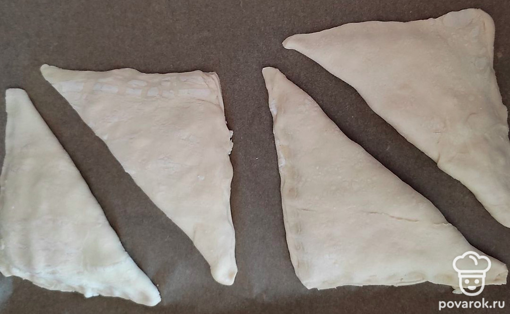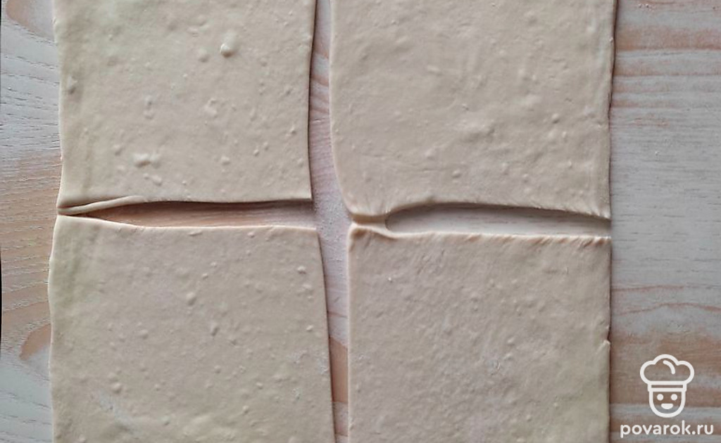 Разморозьте пласты слоеного теста. Раскатайте пласт в одном направлении. Разрежьте раскатанный пласт на 4 квадрата.