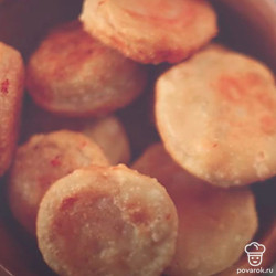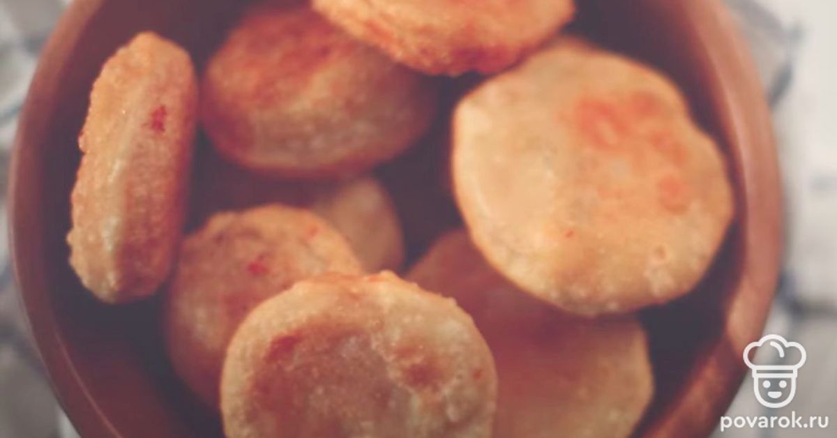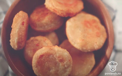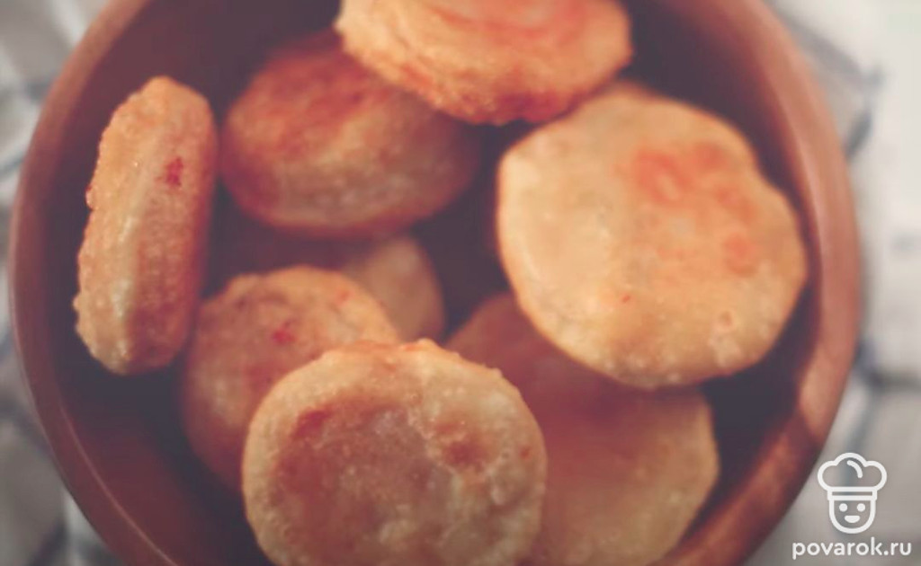 Накройте начинку вторым пластом теста и стаканом вырежьте пирожки. Зафиксируйте края при необходимости. Обжаривайте «бомбочки» во фритюре с двух сторон до золотистой корочки. Готовые пирожки выложите на бумажное полотенце, чтобы удалить излишки жира.
