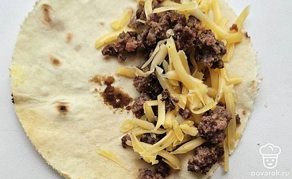 Фарш обжарьте на растительном масле, посолите, выложите на лепешку. Сверху выложите тертый сыр.
