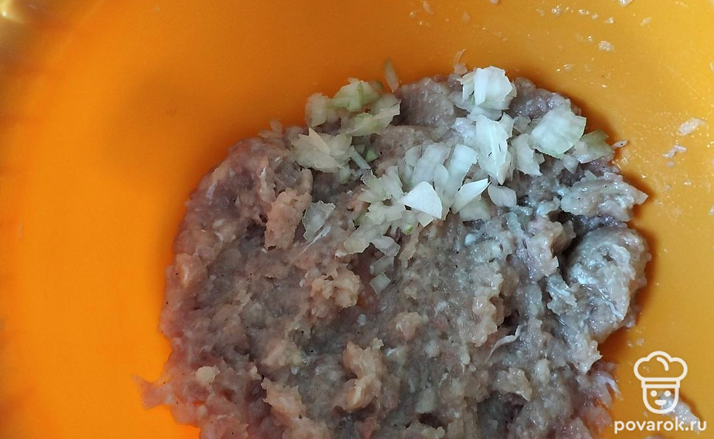 В фарш добавить мелко нарубленный лук, посолить, поперчить по вкусу и перемешать.