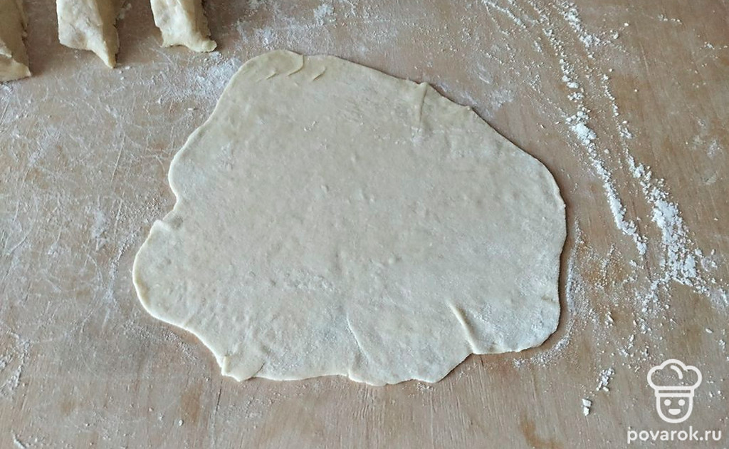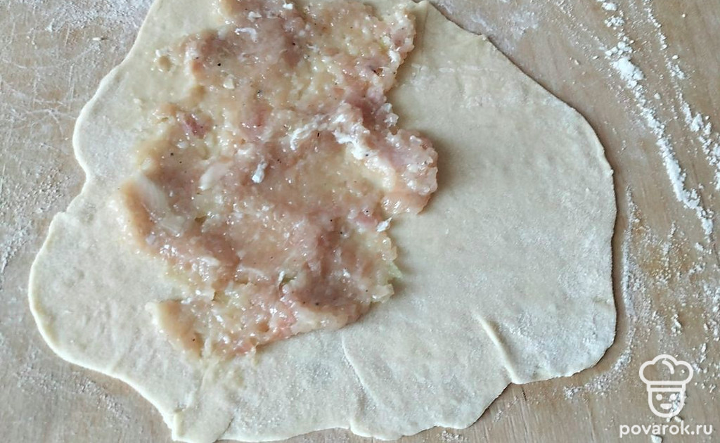 Выложить начинку и распределить по половине теста, не доходя до краев.