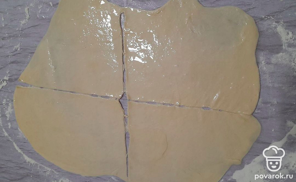 Раскатайте каждую часть теста как можно тоньше, смажьте подсолнечным маслом и разрежьте на четыре части.