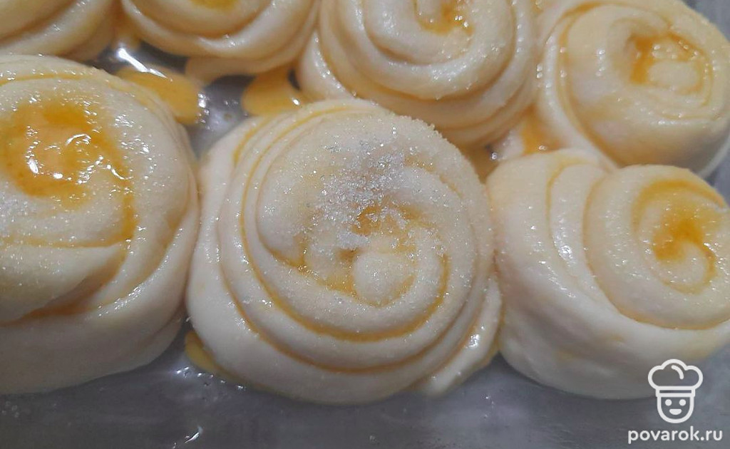 Смажьте булочки желтком и посыпьте оставшимся сахаром. Поставьте их в духовку. Выпекайте 25 минут при 180 градусах.
