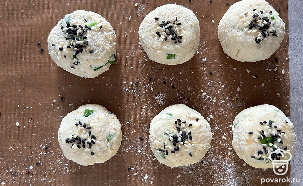 Обмакнув руки в муке, сформируйте шарики среднего размера. Сверху посыпьте кунжутом. Отправьте в разогретую духовку на 20-25 минут при 180 градусах.