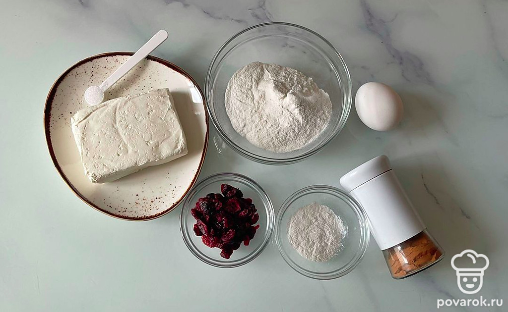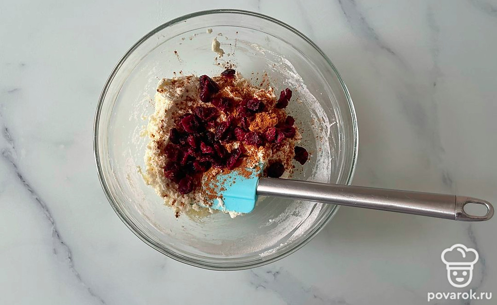Просейте туда муку, разрыхлитель, замесите мягкое тесто. Добавьте клюкву и корицу.