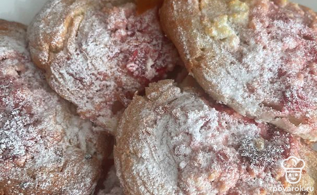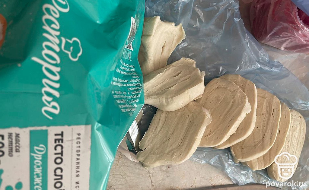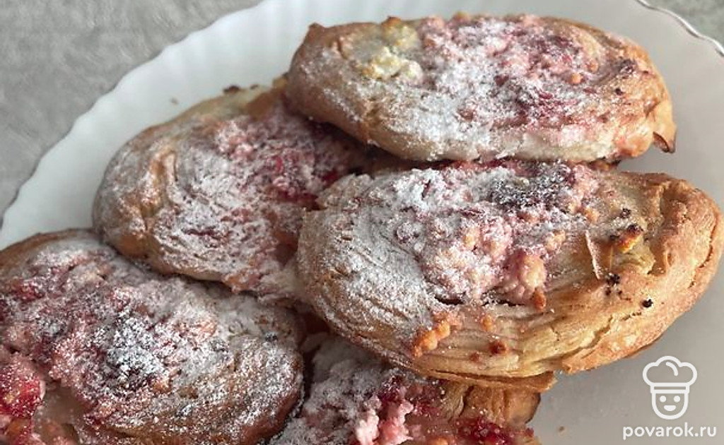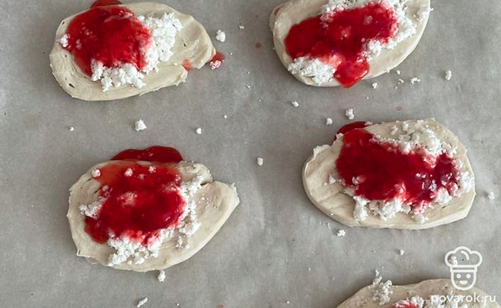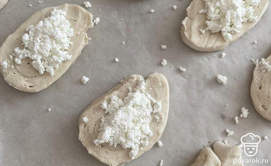 Выложите их на пергаментную бумагу. Сверху выложите творог.