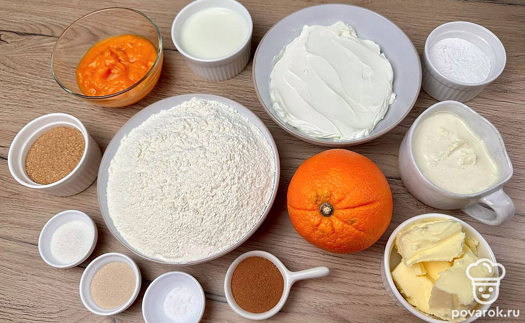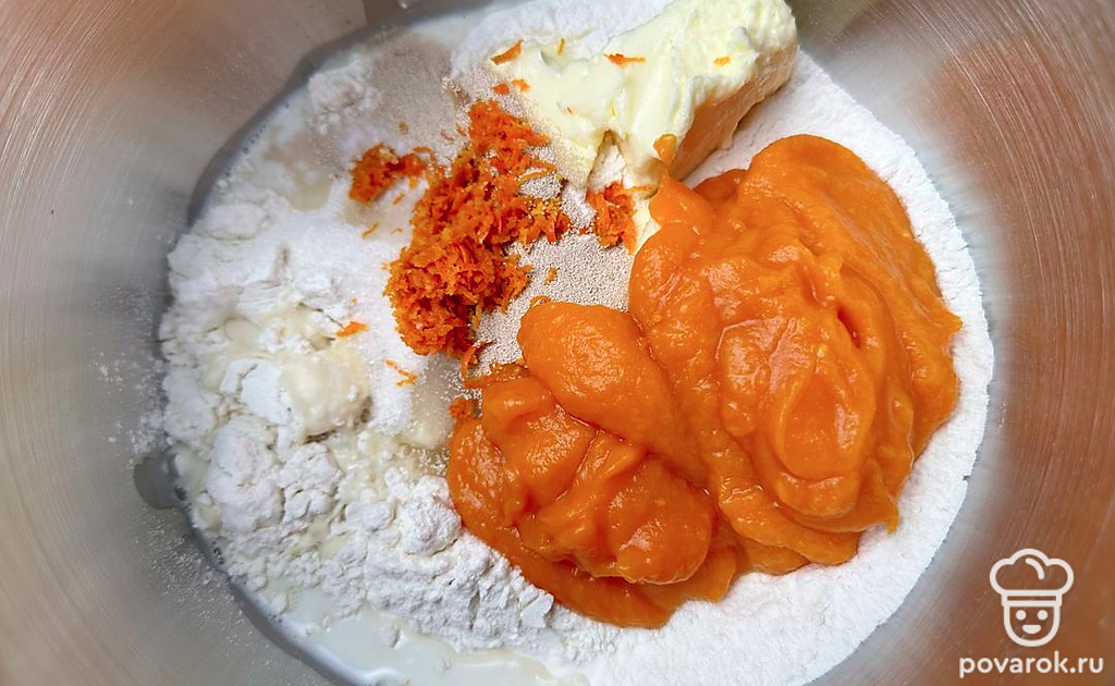В миске соедините муку, теплое молоко, мягкое сливочное масло, ванильный сахар, дрожжи, соль, тыквенное пюре и цедру апельсина. Замесите гладкое эластичное тесто, накройте и уберите в теплое место на 1 час. Можно поставить в духовку, разогретую до 40 градусов.
