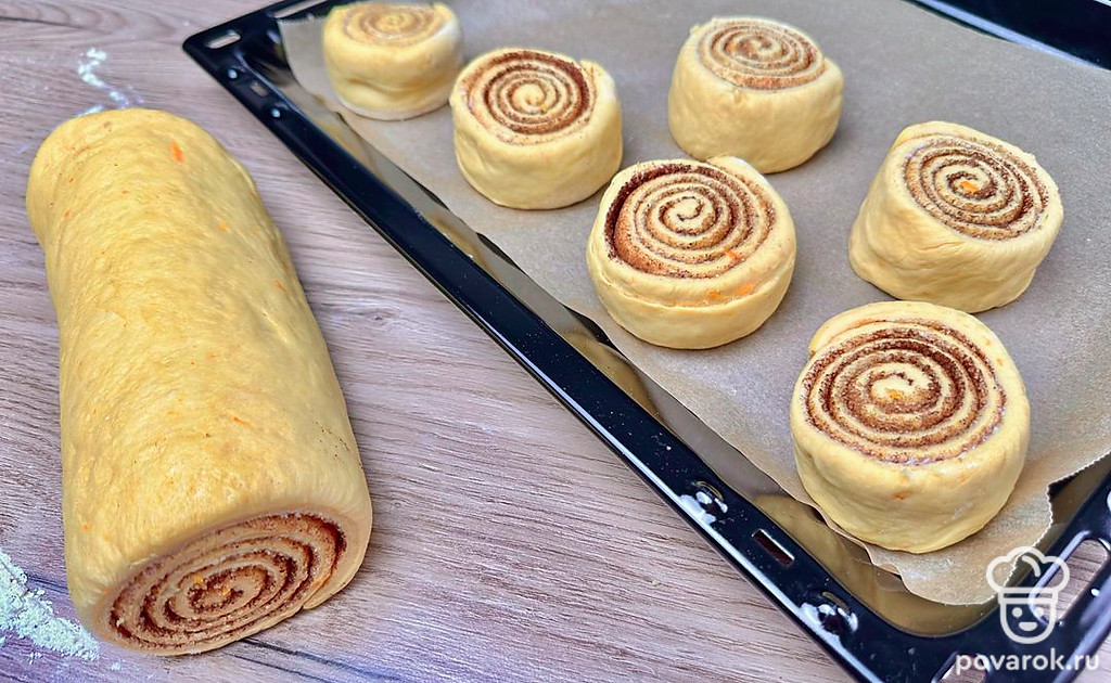 Разрежьте рулет с помощью нитки. Для этого нужно сформировать петлю вокруг рулета и затянуть крест-накрест. У булочек будет красивый ровный срез и идеальная форма. У меня их получилось 11 штук.