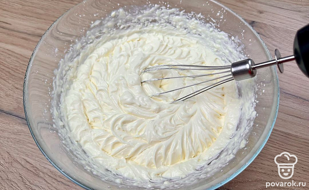 Охлажденный творожный сыр, сливки и пудру взбейте миксером пару минут до однородности. Очень важно не взбивать долго и делать это в чистой и сухой посуде.