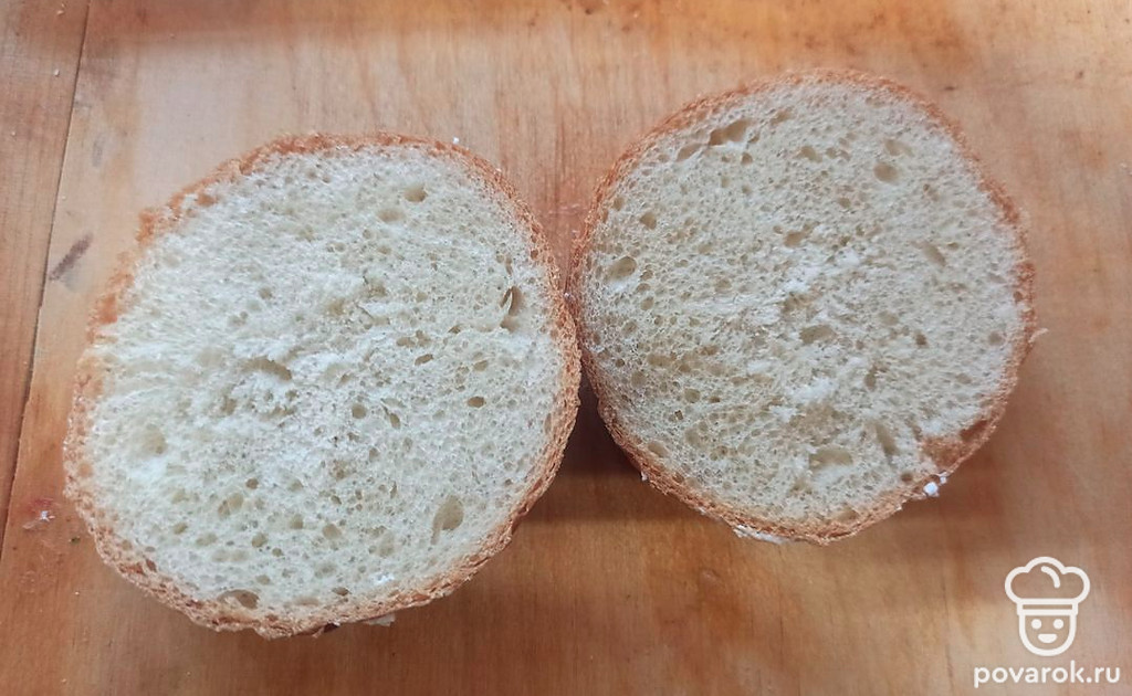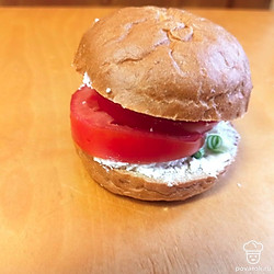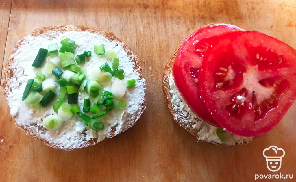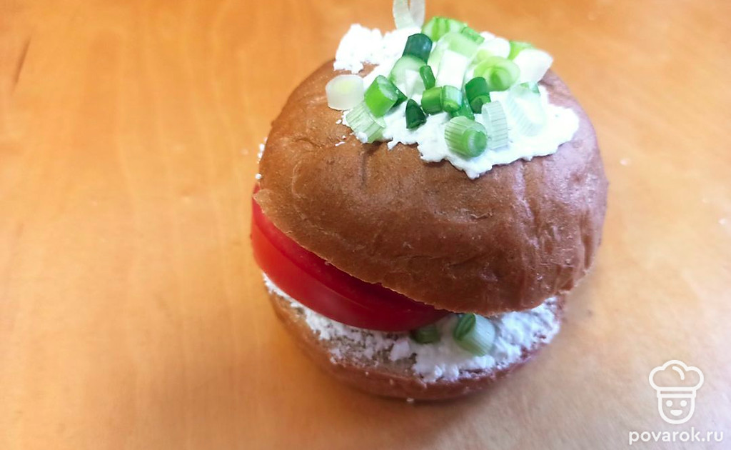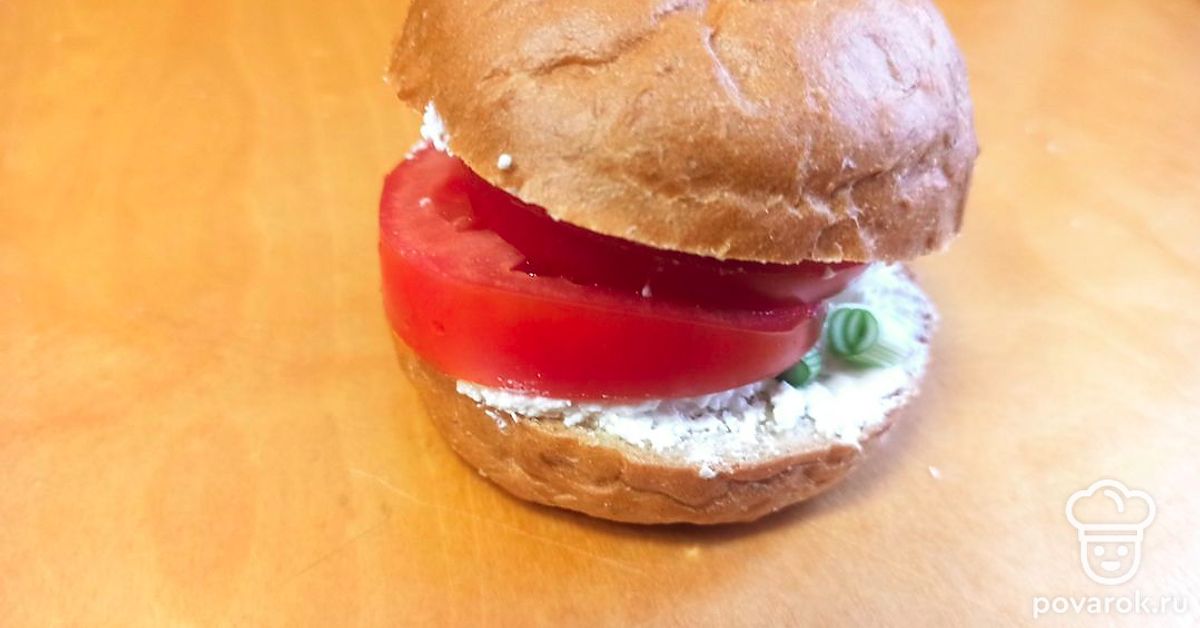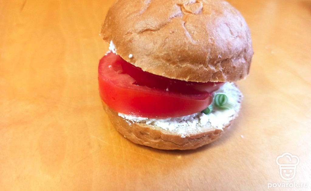 Выложите на 2 половинки измельченный лук (он хорошо будет держаться на твороге) и нарезанный дольками помидор (мне хватает двух долек, но вы можете использовать одну). Немного посолите помидор и закройте булочку.