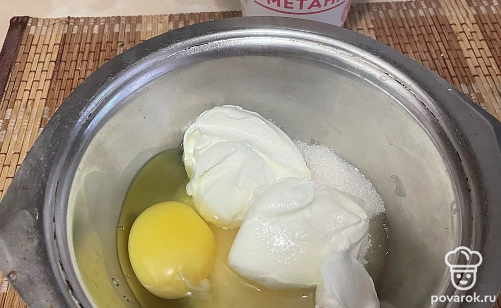 Для теста в отдельной емкости смешайте миксером яйцо, остальную сметану и сахар, ванилин, соль и масло комнатной температуры.