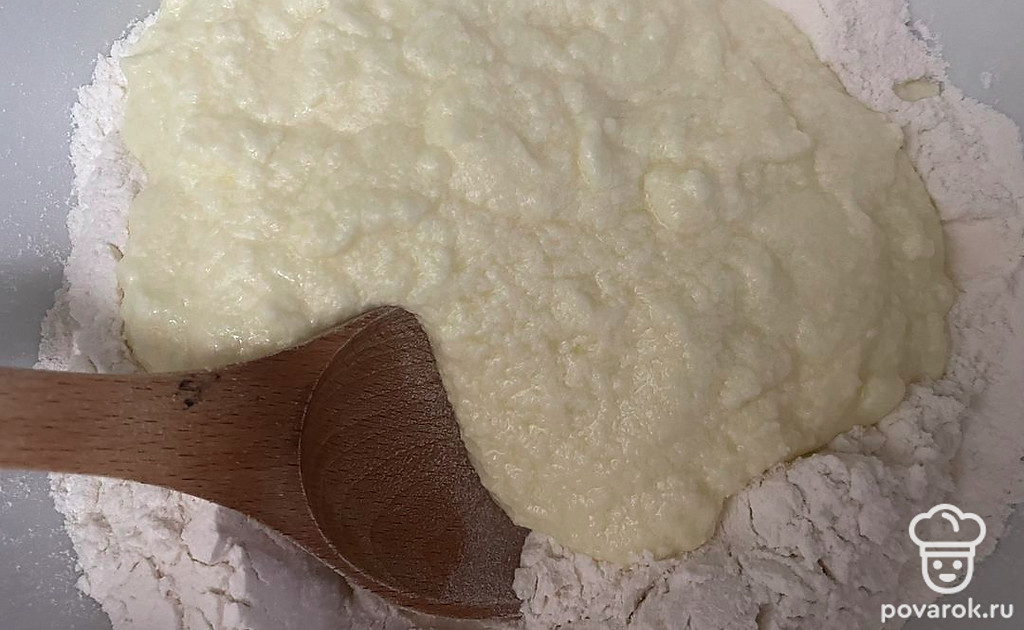 Добавьте муку с содой. Соберите тесто в шар.