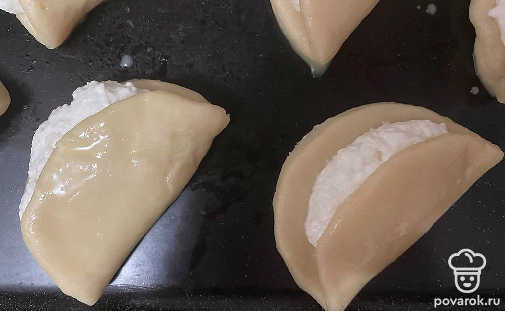 Выложите заготовки сочней на противень, смажьте желтком. Выпекайте около 20-25 минут при 180 градусах.