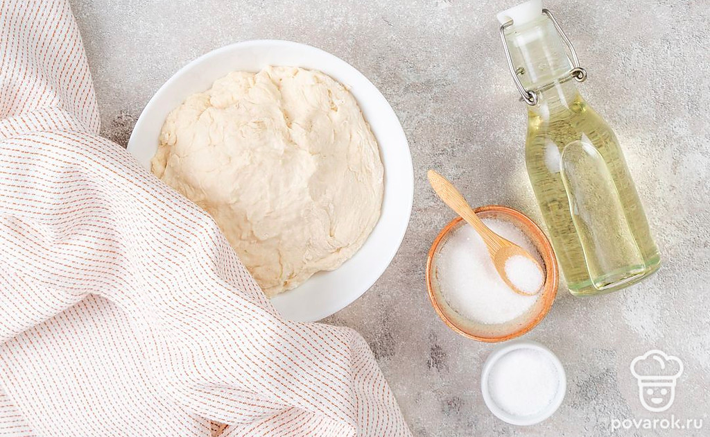 Налейте в миску теплую воду. Добавьте 2 ст.л. сахара и дрожжи, перемешайте. Накройте смесь и оставьте ее на 15 минут. После этого добавьте к дрожжам соль и немного муки. Начните замешивать тесто, постепенно добавляя всю муку. В конце добавьте 2 ст.л. масла и еще раз немного вымесите тесто. После этого накройте его полотенцем и оставьте на 40 минут.