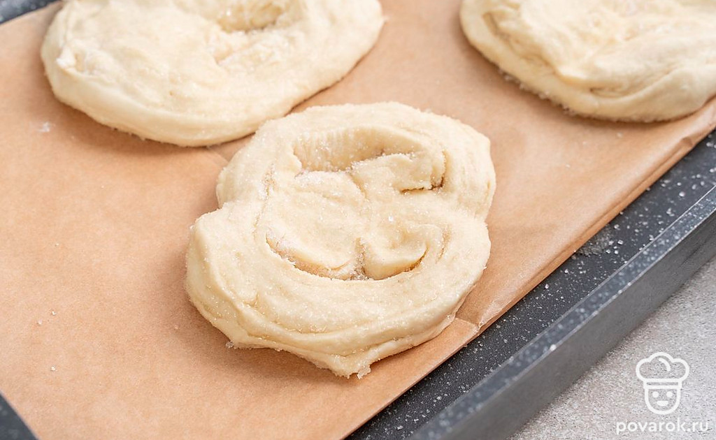 Обомните тесто, а потом снова оставьте под полотенцем на 40 минут. После этого разделите тесто на равные части. Раскатайте одну часть в лепешку толщиной примерно 5 мм. Смажьте ее маслом и посыпьте оставшимся сахаром. Затем сверните лепешку в рулет и сложите его пополам, соединяя края. Переверните заготовку, сделайте на ней разрез и разверните его, формируя плюшки. Повторите действия с остальными заготовками.