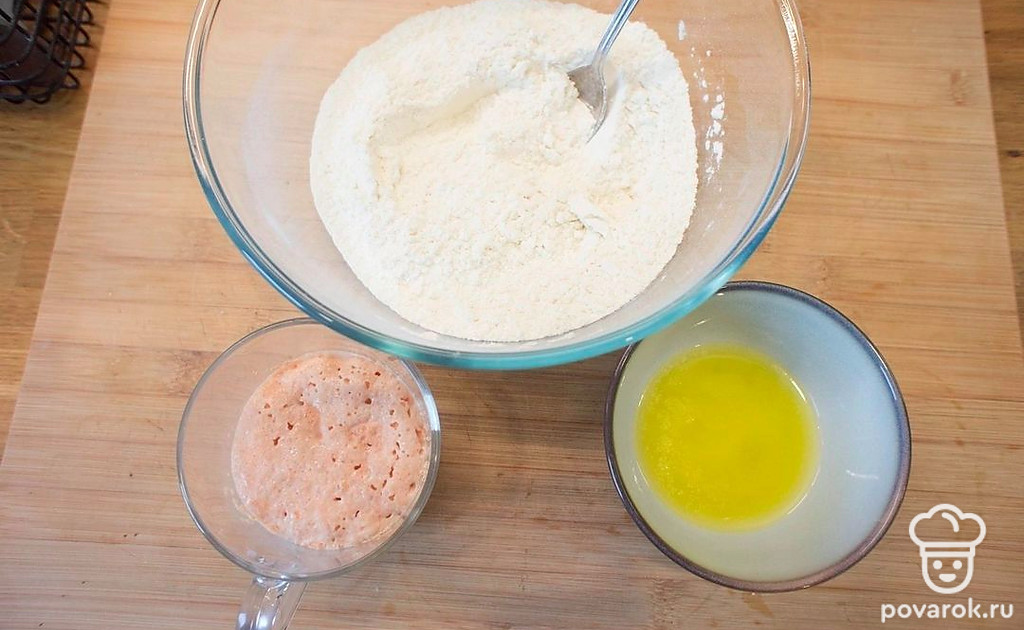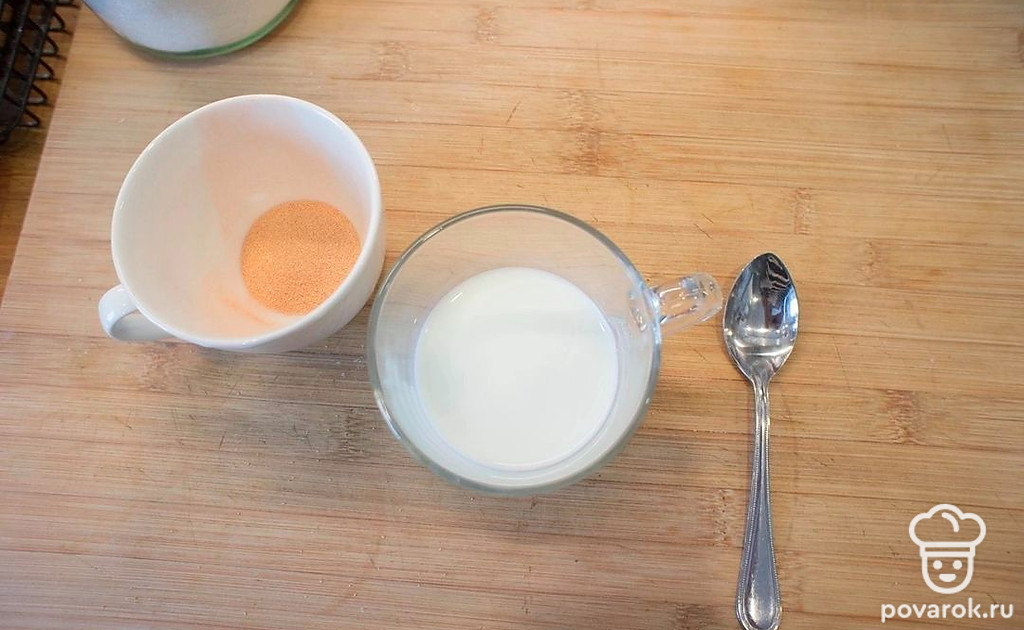 Молоко должно быть теплым. Первым делом приготовьте опару: в молоко добавьте дрожжи и ½ чайную ложку сахара. Перемешайте и отправьте в теплое место подходить (можно поставить около плиты или в выключенную микроволновку).