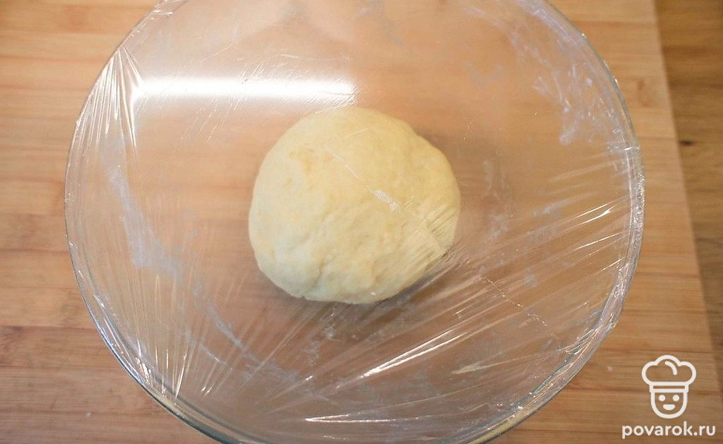 Замесите гладкое, упругое и не липнущее к рукам тесто: сначала лопаткой, а потом руками. При необходимости, добавьте немного теплого молока, чтобы легче было собрать тесто в шар. Если во время вымешивания теста у вас какие-то кусочки прилипают к доске, не старайтесь их вмешать в тесто, чтобы потом в нем не встречались уплотнения. Переложите тесто в чашу, смажьте ее растительным маслом, закройте ее пищевой пленкой и отправьте в теплое место на 2 часа на расстойку. За это время тесто увеличится в 2-2,5 раза.