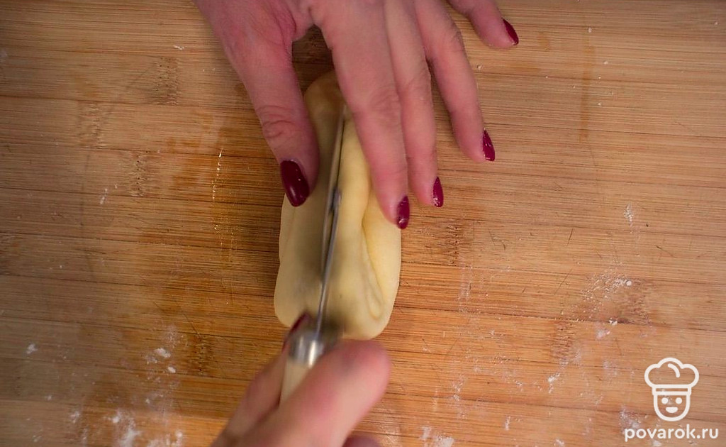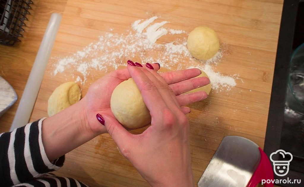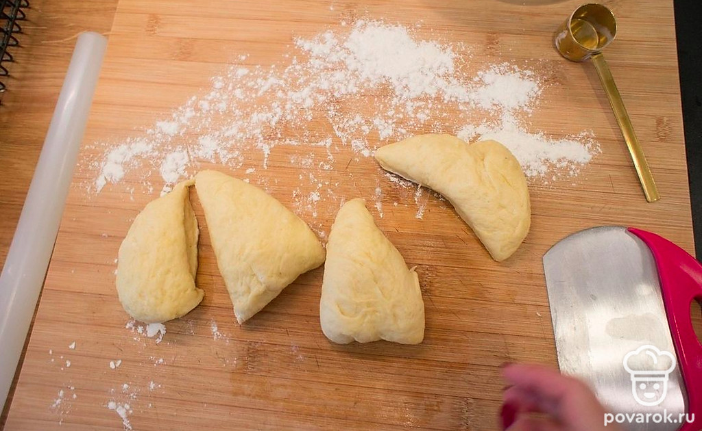 Подошедшее тесто обомните, переложите на рабочую поверхность, присыпанную небольшим количеством муки. Разделите тесто на 4 части.