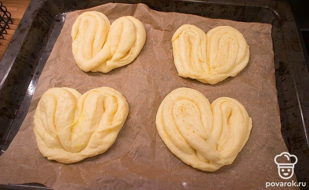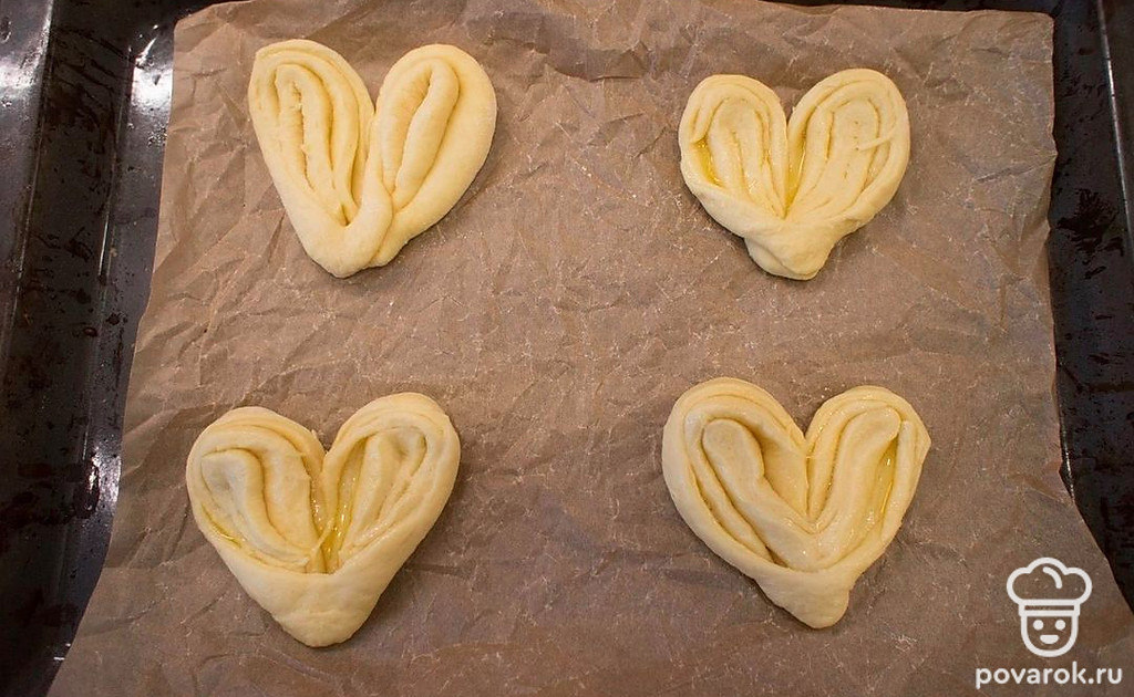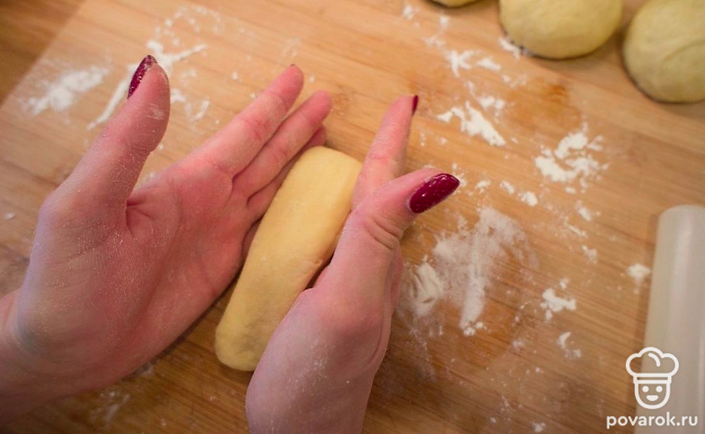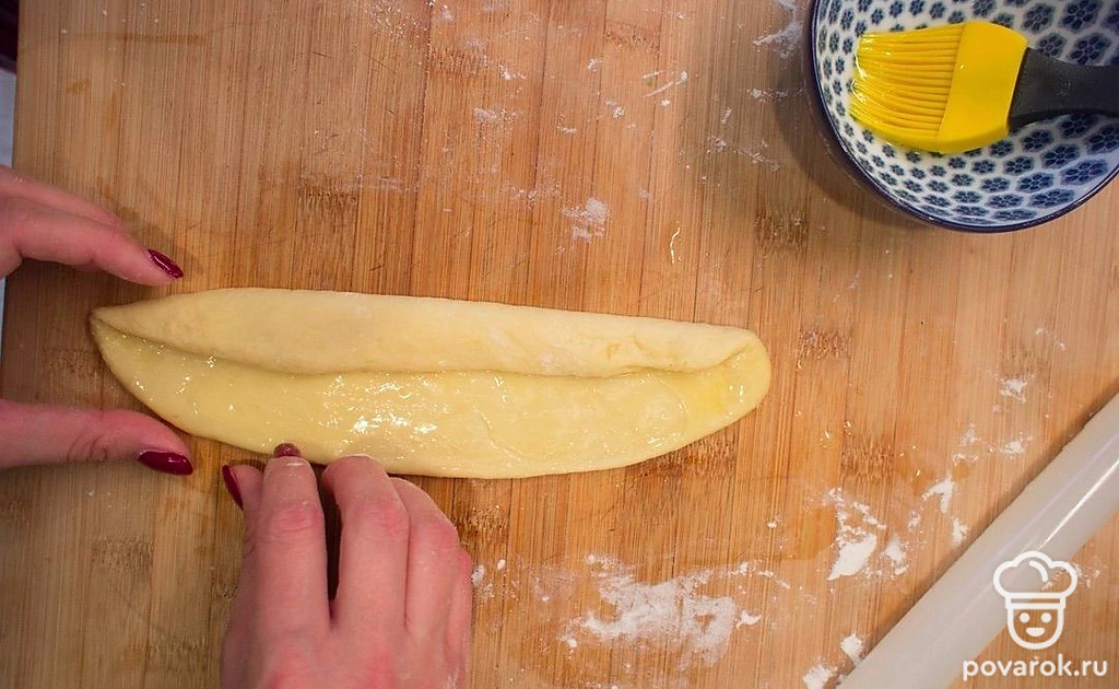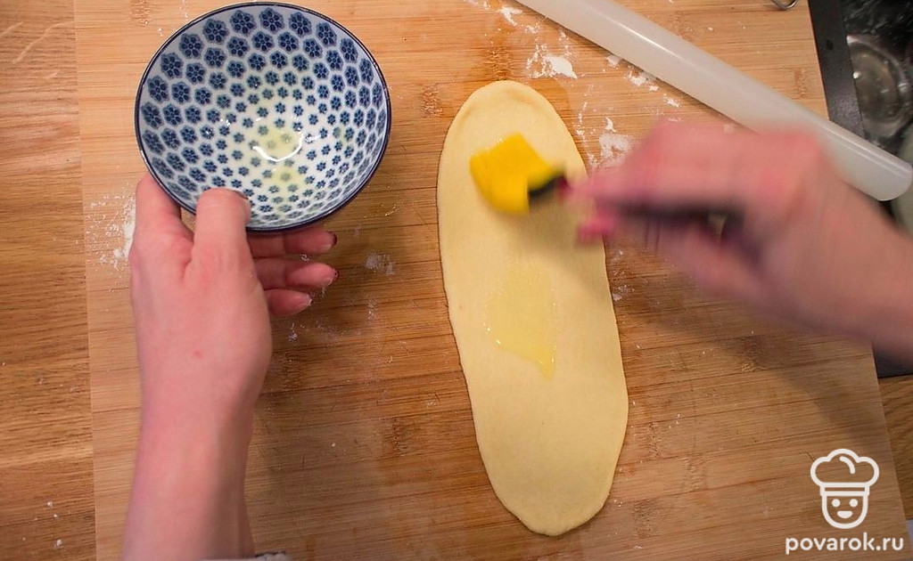 Растопите в микроволновке 10 грамм сливочного масла. Каждый шарик теста раскатайте в длинный пласт, толщиной 5-6 миллиметров. Смажьте его сливочным маслом.