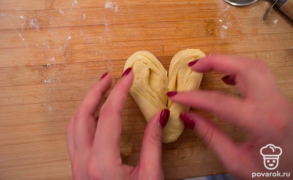 Сверните пласт по длинной стороне, сначала одну сторону загнув к середине, а потом вторую.