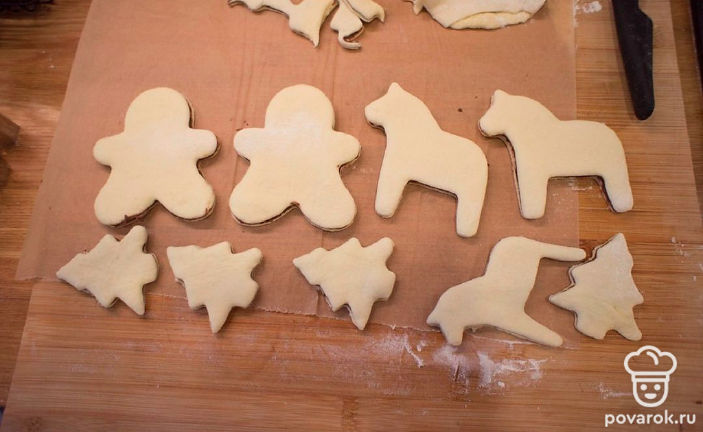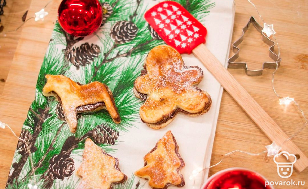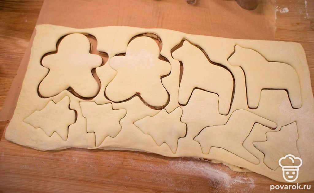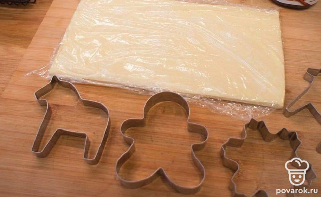 Подготовьте ингредиенты, тесто заранее разморозьте. Также вам понадобятся новогодние формочки.