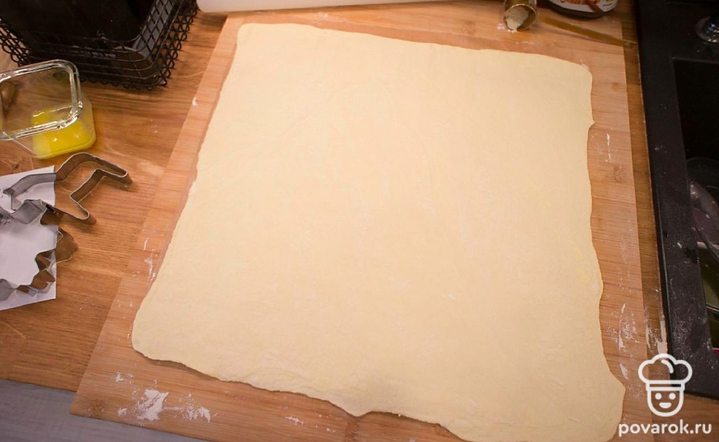 Поставьте духовку разогреваться до 200 градусов, конвекция. Раскатайте тесто так, чтобы оно стало в 2-2,5 раза больше. Старайтесь, чтобы форма была ровная — либо прямоугольник, либо квадрат.