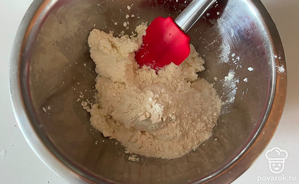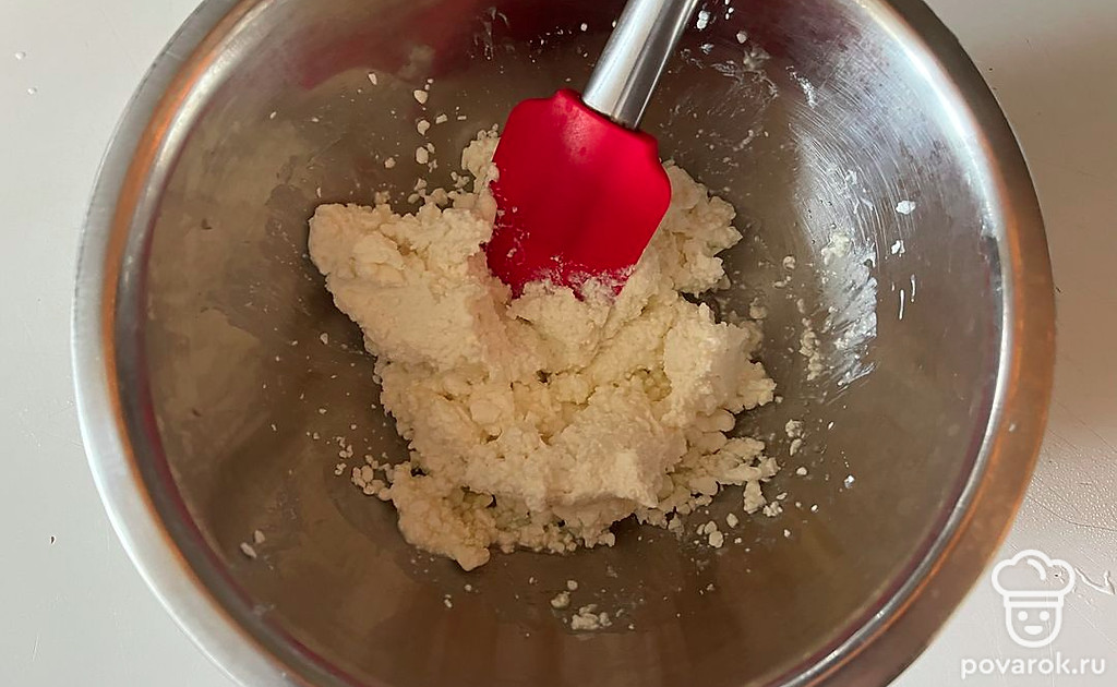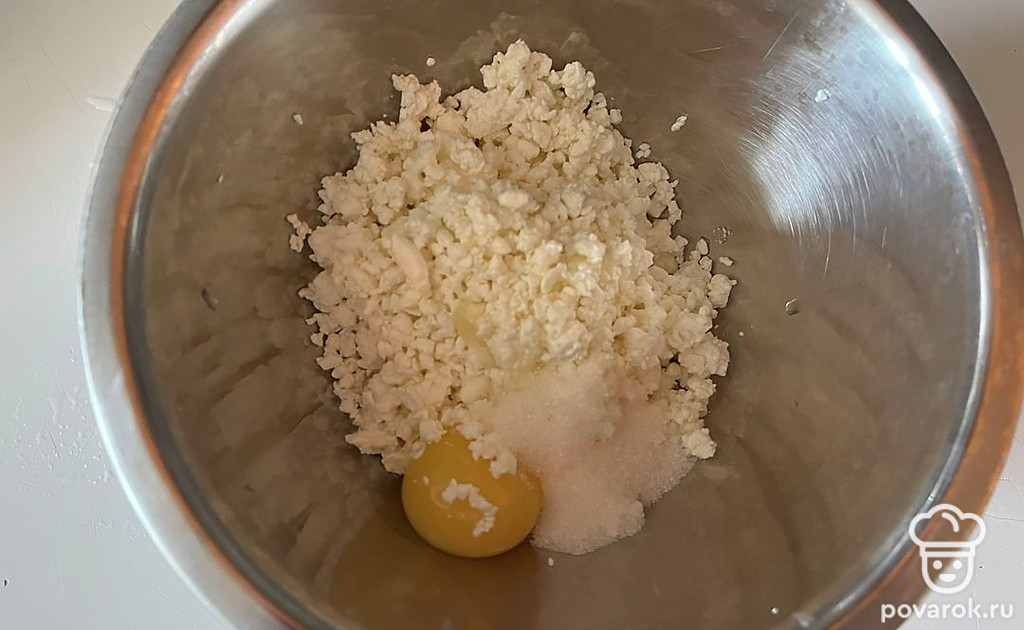 В миске соедините творог, желток куриного яйца и 1 столовую ложку сахара.