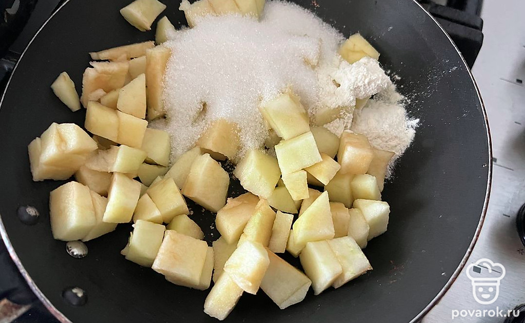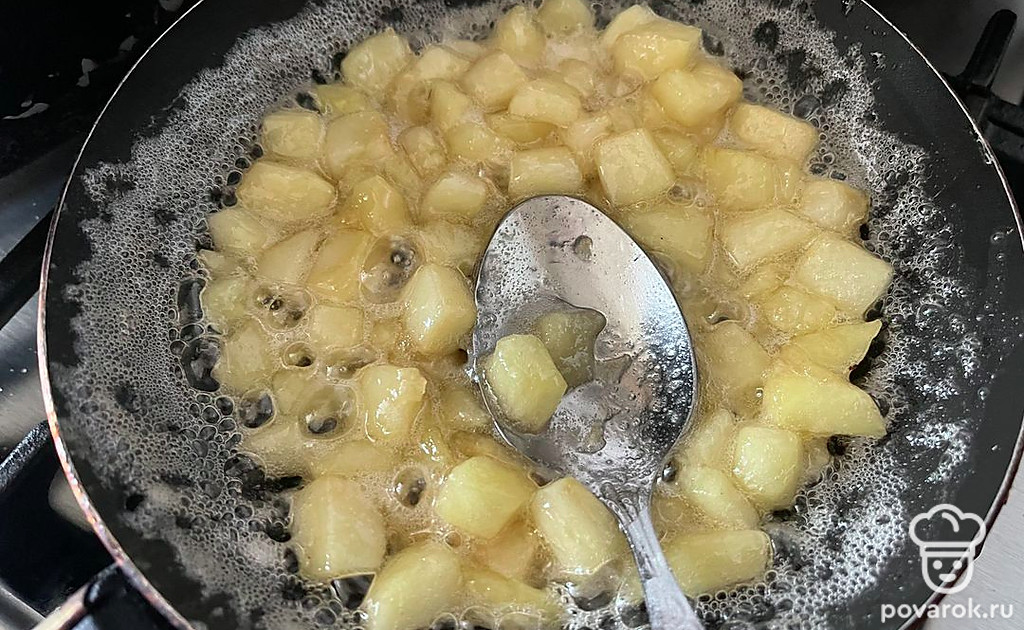 Яблоко нарежьте на маленькие кубики, в сковороде соедините оставшийся сахар и нарезанное яблоко.