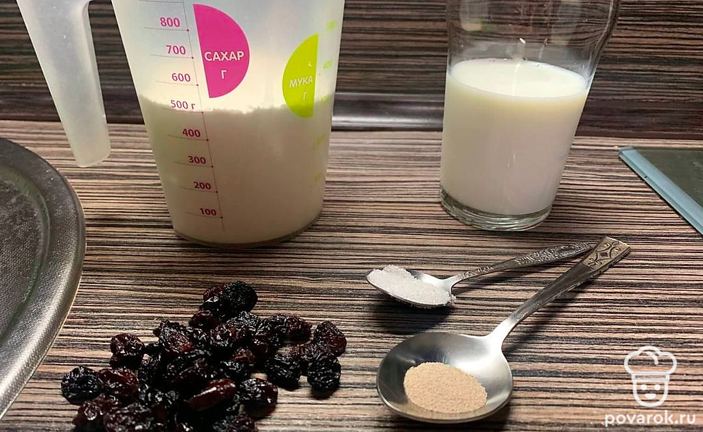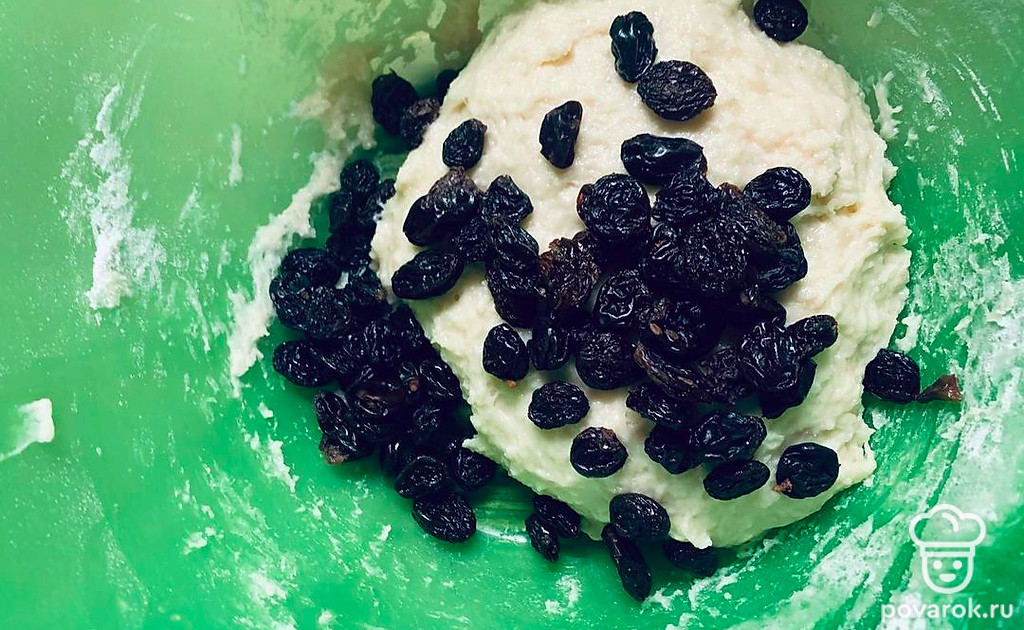 Когда замешаете тесто, добавьте промытый изюм и потихоньку вмешивайте его в смесь.